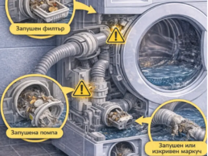 Clogged drain pump – coins, buttons, small objects or fibers can block the pump impeller.